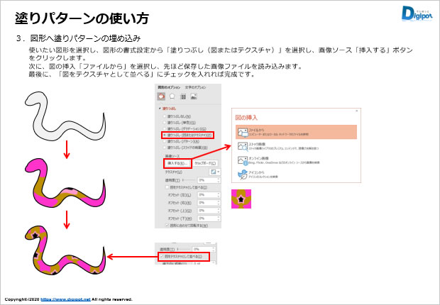 図形の塗りつぶし→塗りつぶし(図またはテクスチャ)より画像を読み込みます。