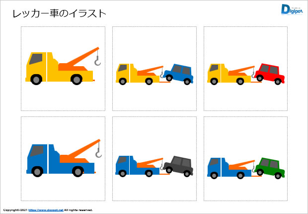 レッカー車のイラスト、作業車両、特殊車両、牽引車両、レッカー移動、車両移動、フチ有フチ無しなど12種類