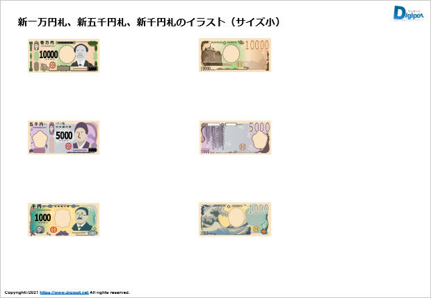 フリー、無料で使える新一万円札、新五千円札、新千円札のイラスト画像です。パワーポイントPPTX形式と、パワーポイントから書き出したPNG透明形式ファイル版を用意しています。