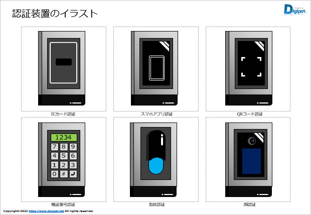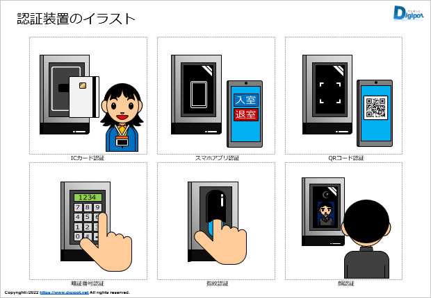 各種認証装置、認証装置の利用イメージです。入退室管理、セキュリティシステムの提案の素材などにご活用ください。
