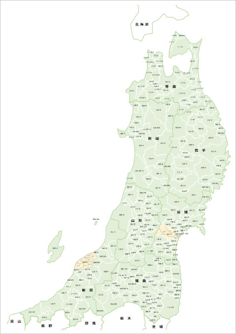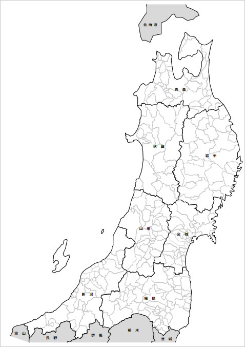 東北7県(青森県、岩手県、山形県、秋田県、宮城県、福島県、新潟県)の市町村文字入り地図と白地図です。地図素材としてご活用ください。