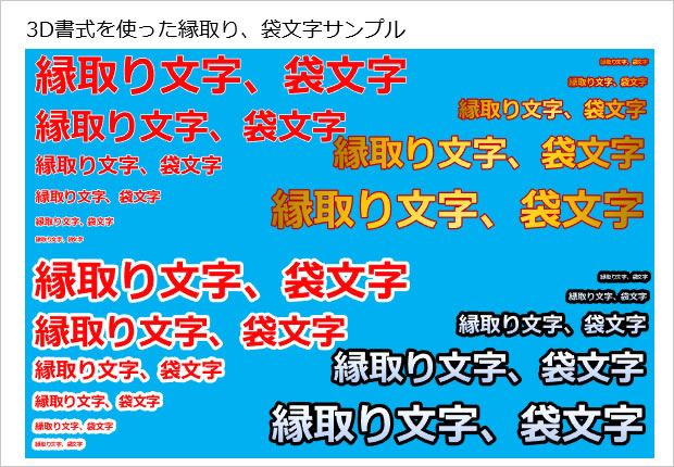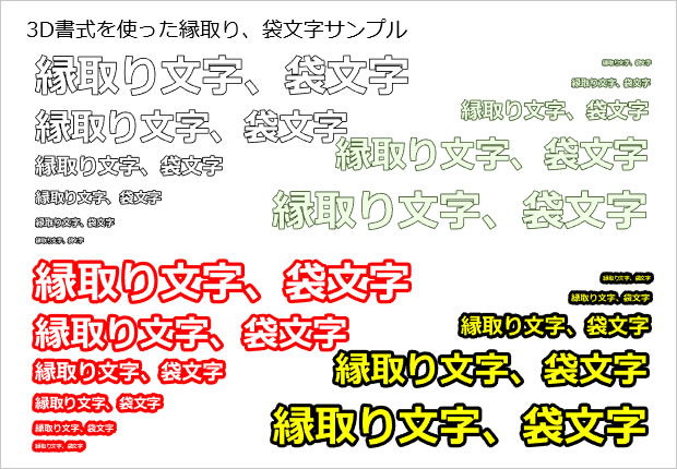 3D書式を使った縁取り、袋文字サンプル、各種サイズやカラーなど