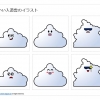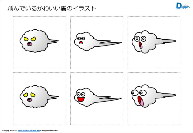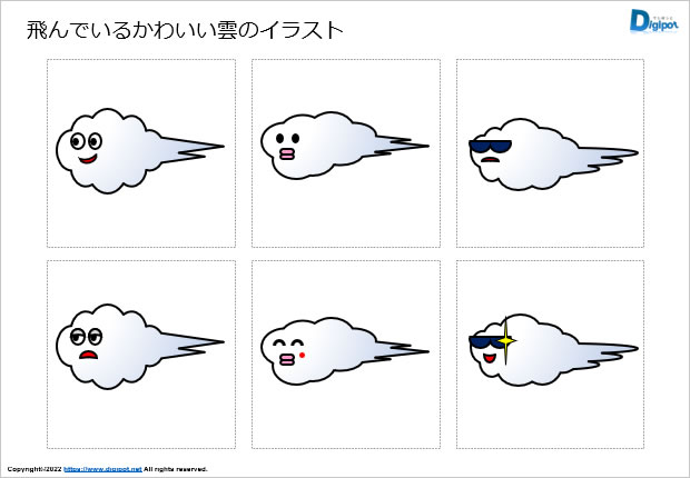 フリー、無料で使える飛んでいるかわいい雲のイラスト画像です。パワーポイントPPTX形式と、パワーポイントから書き出したPNG透明形式ファイル版を用意しています。