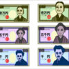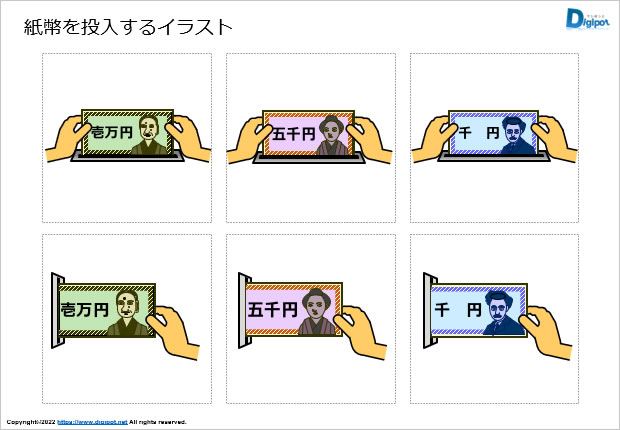 紙幣を投入するイラスト、一万円札の投入、五千円札の投入、二千円札の投入、各種投入方向、パターンなど12種類