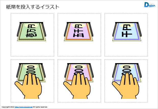フリー、無料で使える紙幣を投入するイラスト画像です。パワーポイントPPTX形式と、パワーポイントから書き出したPNG透明形式ファイル版を用意しています。