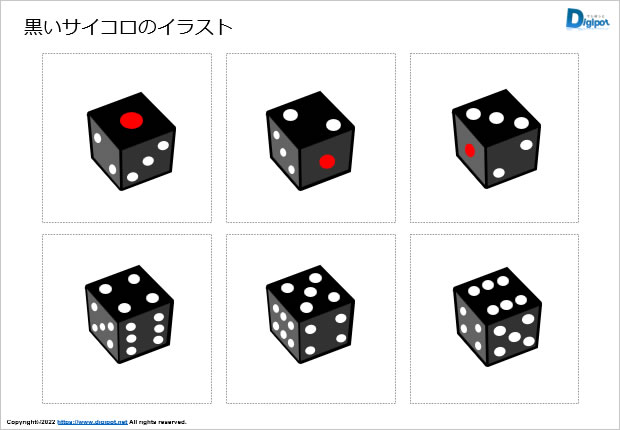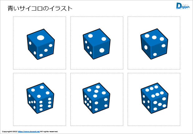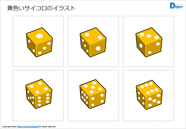 フリー、無料で使えるカラーサイコロのイラスト画像です。パワーポイントPPTX形式と、パワーポイントから書き出したPNG透明形式ファイル版を用意しています。