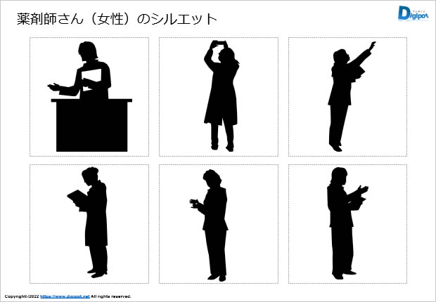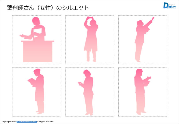 薬剤師さん(女性)のシルエット、案内、薬を探す、薬を確認、各種ポーズ、白黒、グラデーションなど12種類