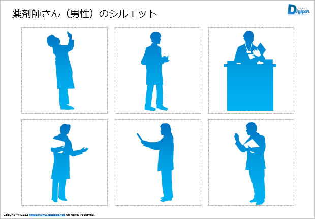 薬剤師さん(男性、女性)の各種ポーズのシルエットイメージです。薬局関連の資料作りの素材などにご活用ください。