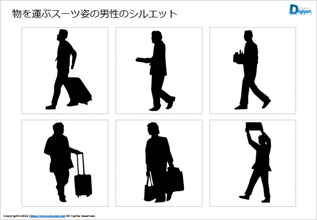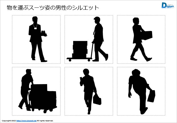 物を運ぶスーツ姿の男性の各種ポーズのシルエットイメージです。ビジネス関連の資料作りの素材にご活用ください。