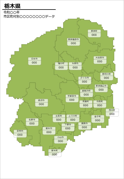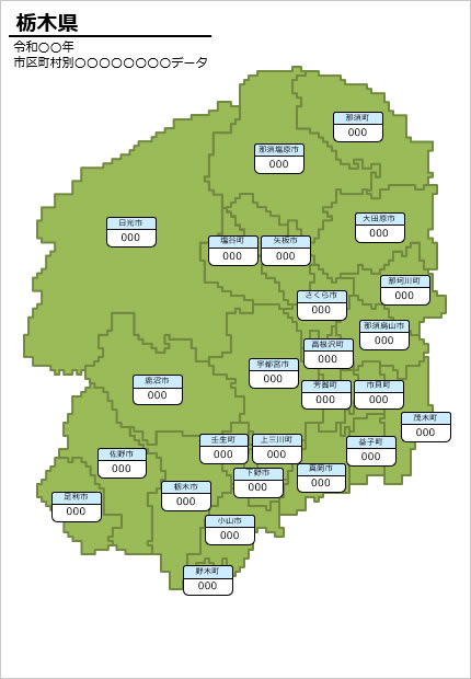 栃木県の市町村別の数値入力データマップ(パワーポイント/エクセル)|地域データの視覚化に