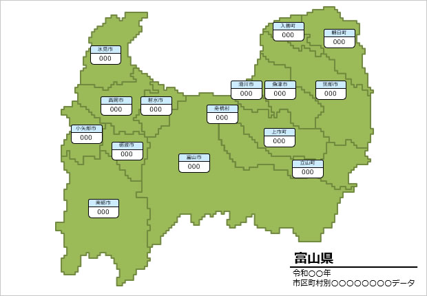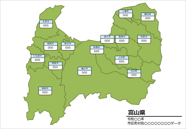 フリー、無料で使える富山県の市町村別の数値入力データマップです。パワーポイントPPTX形式と、パワーポイントからコピーペーストしたエクセルXLSX形式ファイル版を用意しています。