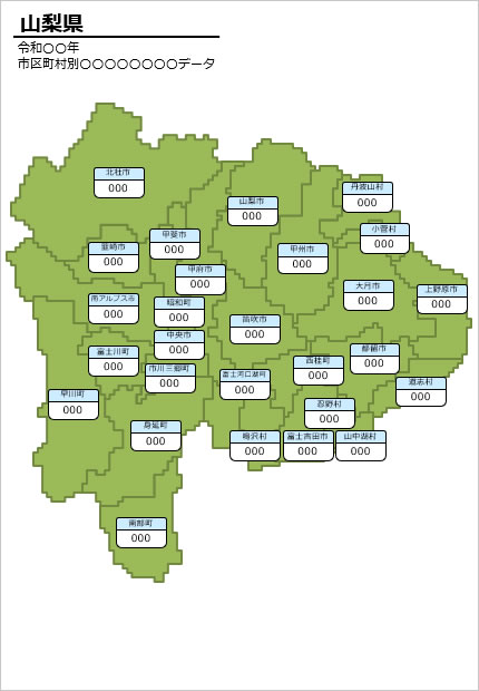 フリー、無料で使える山梨県の市町村別の数値入力データマップです。パワーポイントPPTX形式と、パワーポイントからコピーペーストしたエクセルXLSX形式ファイル版を用意しています。