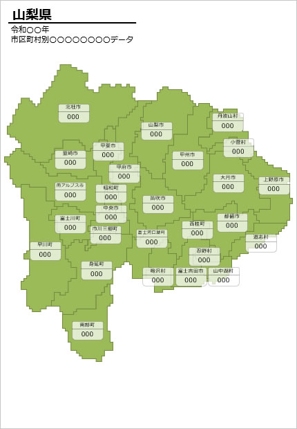 山梨県の市町村別の数値入力データマップ(パワーポイント/エクセル)|地域データの視覚化に