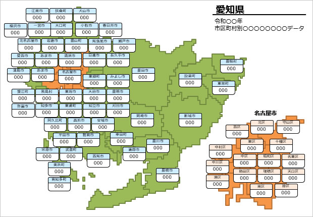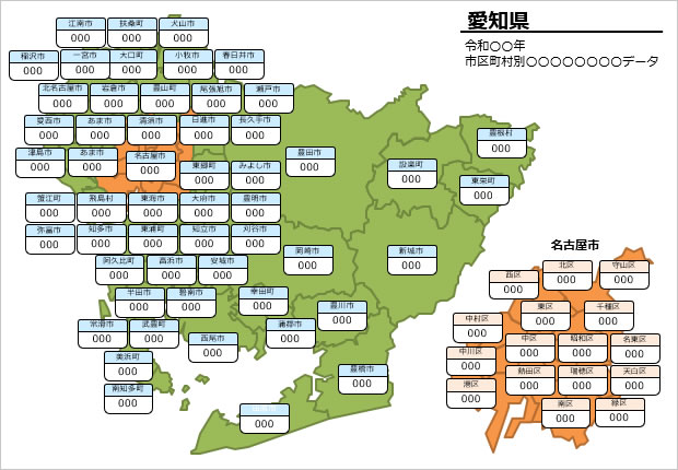 フリー、無料で使える愛知県の市町村別の数値入力データマップです。パワーポイントPPTX形式と、パワーポイントからコピーペーストしたエクセルXLSX形式ファイル版を用意しています。