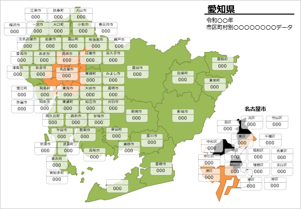 愛知県の市町村別の数値入力データマップ(パワーポイント/エクセル)|地域データの視覚化に