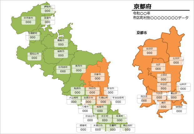 京都府の市区町村別の数値入力データマップ(パワーポイント/エクセル)|地域データの視覚化に