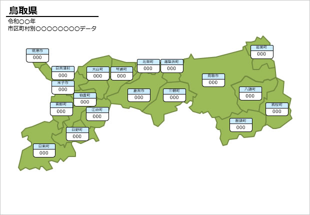 フリー、無料で使える鳥取県の市町村別の数値入力データマップです。パワーポイントPPTX形式と、パワーポイントからコピーペーストしたエクセルXLSX形式ファイル版を用意しています。