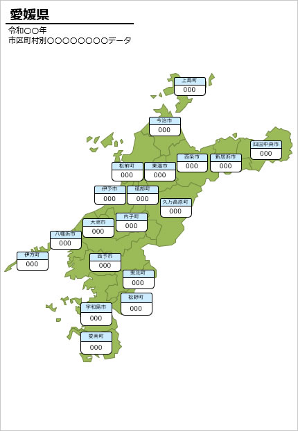 フリー、無料で使える愛媛県の市町村別の数値入力データマップです。パワーポイントPPTX形式と、パワーポイントからコピーペーストしたエクセルXLSX形式ファイル版を用意しています。