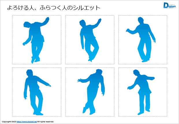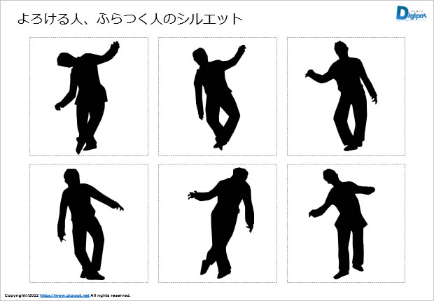よろける人、ふらつく人のシルエット、ズッコケ、よろめき、ふらつき、各種ポーズ、白黒、グラデーションなど12種類