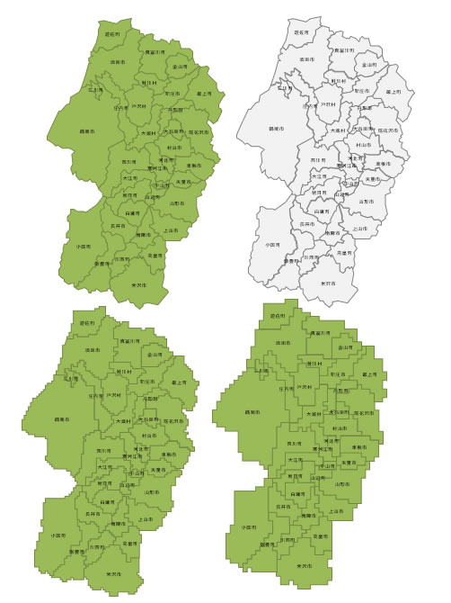 山形県の地図へ数値などのデータ入力用のマップ素材です。山形県の市区町村別のデータ、情報を視覚化する資料づくりの素材に最適です。