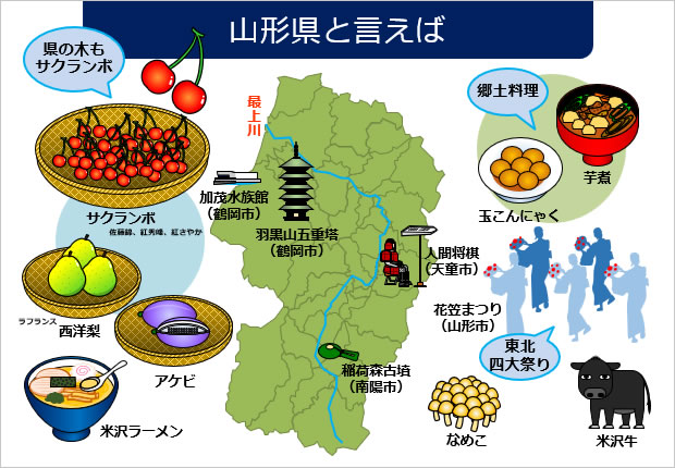 山形県の地図、白地図、市区町村地図、データマップ、山形県の名産特産のイラスト、山形県に関するイラスト、山形県の花、木、鳥のイラストのフリー素材、無料素材をまとめています。