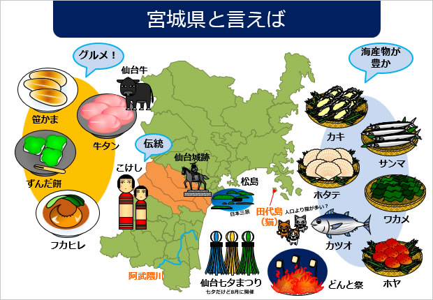 宮城県の地図、白地図、市区町村地図、データマップ、宮城県の名産特産のイラスト、宮城県に関するイラスト、宮城県の花、木、鳥のイラストのフリー素材、無料素材をまとめています。