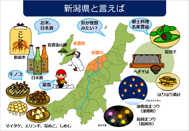 新潟県の地図、白地図、市区町村地図、データマップ、新潟県の名産特産のイラスト、新潟県に関するイラスト、新潟県の花、木、鳥のイラストのフリー素材、無料素材をまとめています。