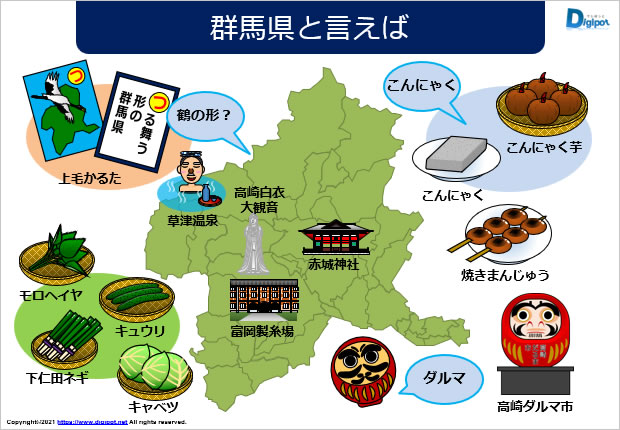 群馬県の名産品、特産品、建造物、花鳥木などのイラスト集です。群馬県を紹介する資料作りにも最適です。