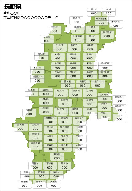 長野県の地図へ数値などのデータ入力用のマップ素材です。長野県の市区町村別のデータ、情報を視覚化する資料づくりの素材に最適です。