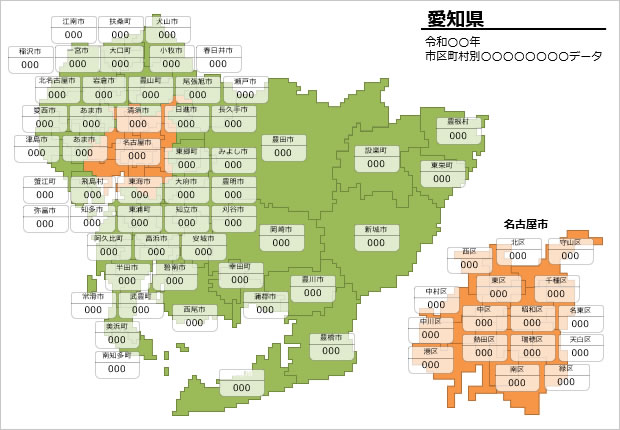 愛知県の地図へ数値などのデータ入力用のマップ素材です。愛知県の市区町村別のデータ、情報を視覚化する資料づくりの素材に最適です。