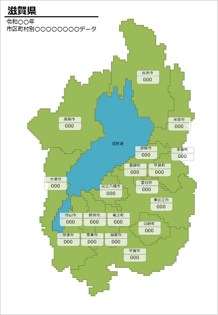 滋賀県の地図へ数値などのデータ入力用のマップ素材です。滋賀県の市区町村別のデータ、情報を視覚化する資料づくりの素材に最適です。