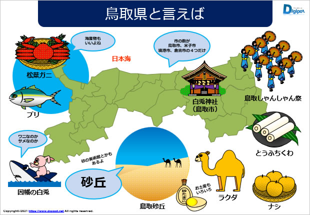 鳥取県の地図、白地図、市区町村地図、データマップ、鳥取県の名産特産のイラスト、鳥取県に関するイラスト、鳥取県の花、木、鳥のイラストのフリー素材、無料素材をまとめています。