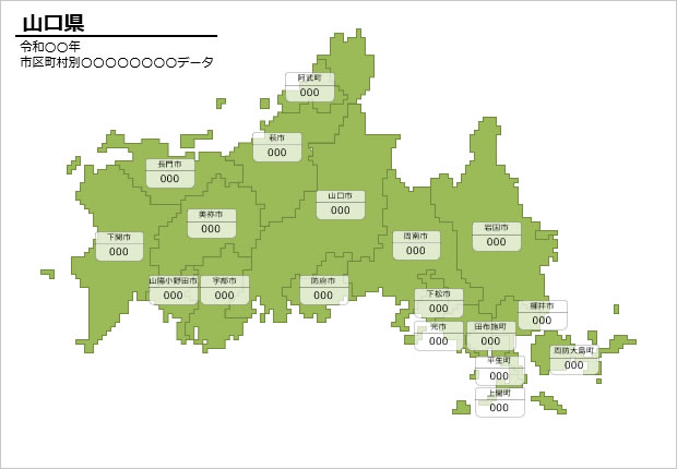山口県の地図へ数値などのデータ入力用のマップ素材です。山口県の市区町村別のデータ、情報を視覚化する資料づくりの素材に最適です。