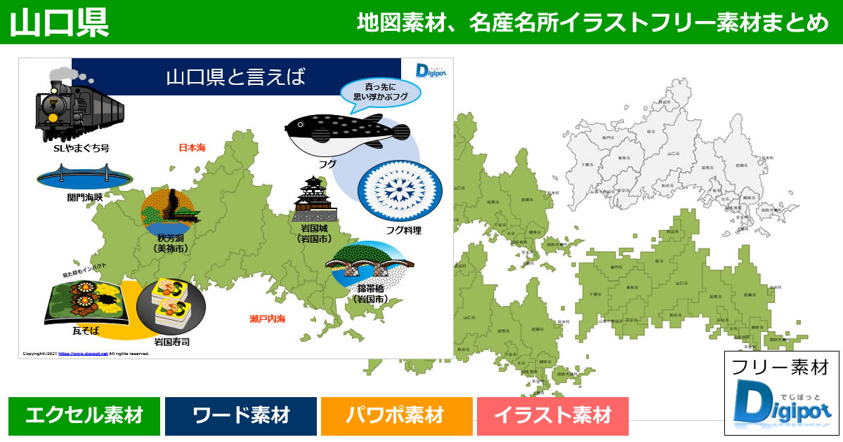 山口県地図のパワポ、エクセル、ワード、イラストのフリー素材まとめ