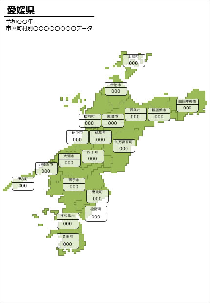 愛媛県の地図へ数値などのデータ入力用のマップ素材です。愛媛県の市区町村別のデータ、情報を視覚化する資料づくりの素材に最適です。