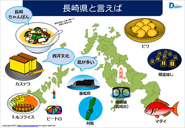長崎県の地図、白地図、市区町村地図、データマップ、長崎県の名産特産のイラスト、長崎県に関するイラスト、長崎県の花、木、鳥のイラストのフリー素材、無料素材をまとめています。