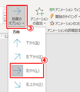 作成したバーを選択した状態で、(1)アニメーションタブを選択し、(2)スライドインを選択、(3)効果オプションでリストを開き、(4)左からを選択します。