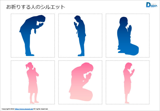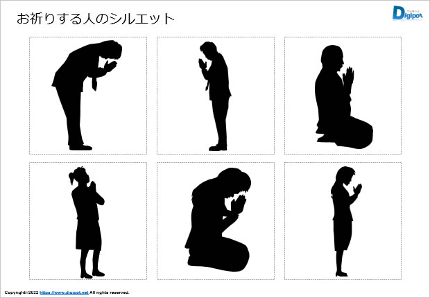 お祈りする人のシルエット、お墓参り、合掌、手を合わせる女性、手を合わせる男性、白黒、グラデーションなど12種類