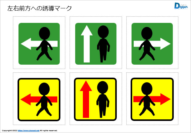 左右前方への誘導マーク、右方向への誘導マーク、左方向への誘導マーク、前方への誘導マークなど6種類