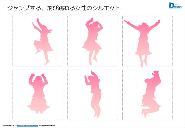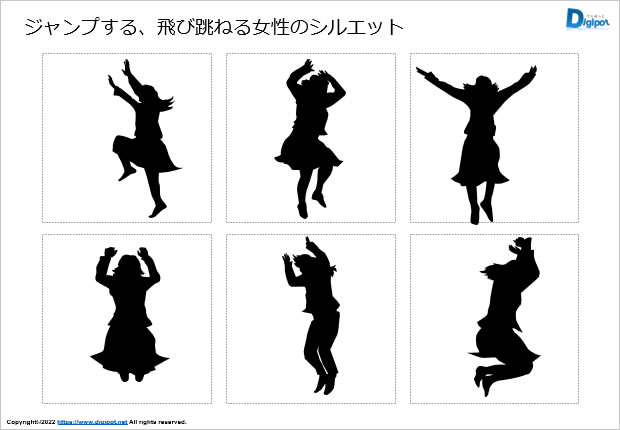 フリー、無料で使えるジャンプする、飛び跳ねる女性のシルエット画像です。パワーポイントPPTX形式と、パワーポイントから書き出したPNG透明形式ファイル版を用意しています。