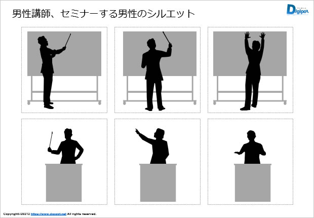 男性講師、セミナーする男性のシルエット、講習会、説明会、ホワイトボードで説明、指差し棒で説明など12種類