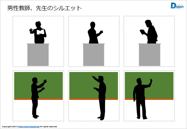 男性教師、先生のシルエット、授業中、生徒を指さす、黒板で説明、教壇に立つなど12種類