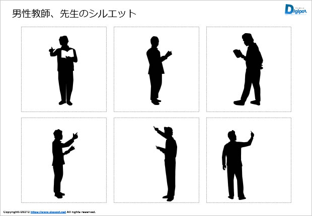 フリー、無料で使える男性教師、先生のシルエット画像です。パワーポイントPPTX形式と、パワーポイントから書き出したPNG透明形式ファイル版を用意しています。
