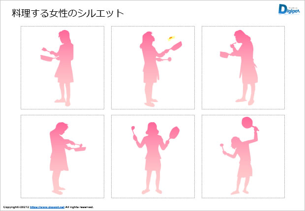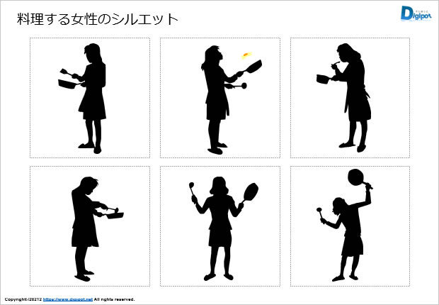 フリー、無料で使える料理する女性のシルエット画像です。パワーポイントPPTX形式と、パワーポイントから書き出したPNG透明形式ファイル版を用意しています。