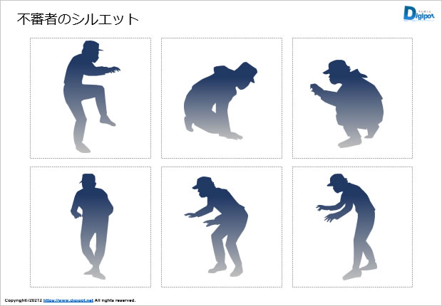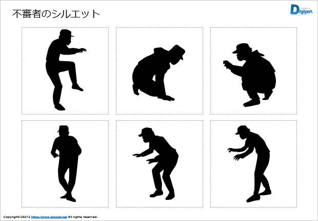 不審者のシルエット、泥棒、侵入、怪しい人、ソローリ移動、白黒、グラデーションなど12種類