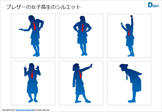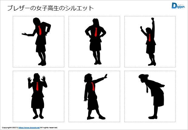 ブレザーの女子高生のシルエット、驚く、案内する、喜ぶ、ネクタイ姿、白黒、グラデーションなど12種類