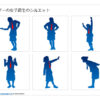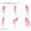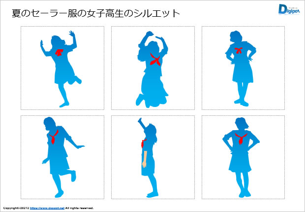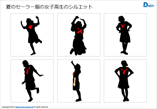 夏のセーラー服の女子高生のシルエット、飛び跳ねる、ジャンプ、気取る、喜ぶ、驚く、手をかざす、白黒、グラデーションなど12種類