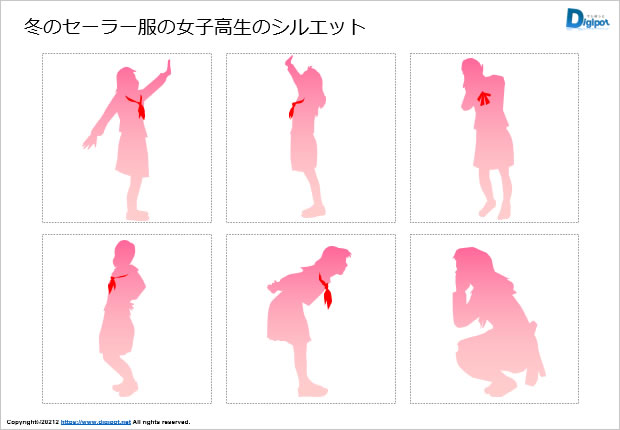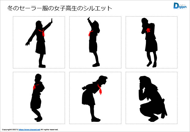 冬のセーラー服の女子高生のシルエット、手をかざす、座り込む、のぞき込む、照れる、白黒、グラデーションなど12種類