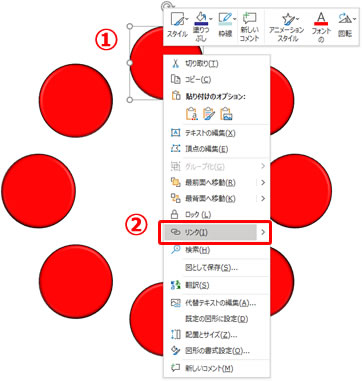 最後にリンク設定した図形を、すべて選択した状態で右クリックでメニューを表示させグループ化を選択します。