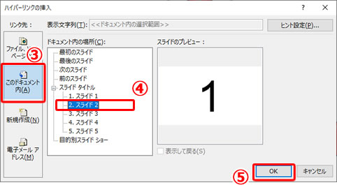 ハイパーリンクの挿入画面が開いたら、(3)このドキュメント内を選択、(4)任意のスライド番号を選択、(5)OKをクリックします。